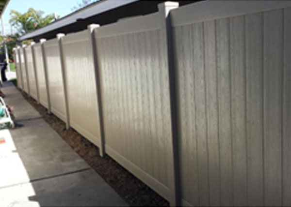 This residential fence installation in Lomita, CA features a 6 ft tall adobe wood grain vinyl privacy fence. The privacy fence was installed on the homeowner's dividing property line.