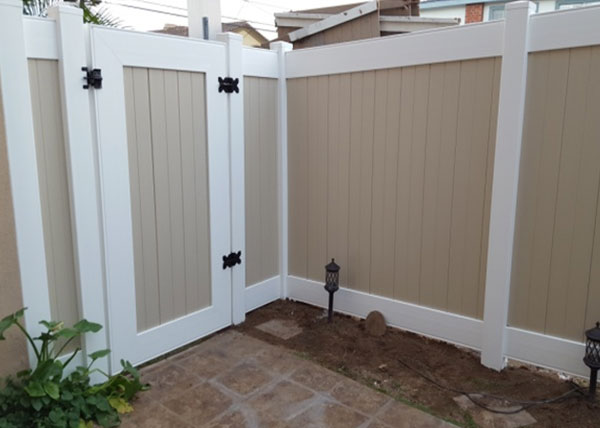 We installed this two-tone vinyl privacy fence in Redondo Beach, CA. The fence has white posts, tan boards, and a white frame. The fence also features a walk-through gate that latches shut.