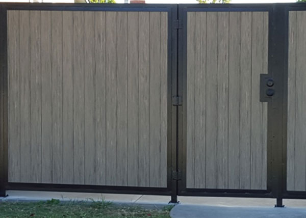 We installed this iron-framed, double-swing gate in Bellflower, CA. The six-foot-tall gate has walnut vinyl vertical boards and a picket top. We created this gate to meet our client's privacy and design preferences.