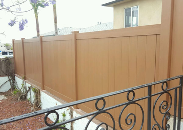 This is an vinyl fence we installed in Manhattan Beach, CA. The color is called Adobe, and is part of our DuraGrain series, which looks like real wood. Our vinyl fences and gates also come in a tan or white color, and a wood grain or smooth finish. All of our vinyl products come with a lifetime warranty offered by the manufacturer.