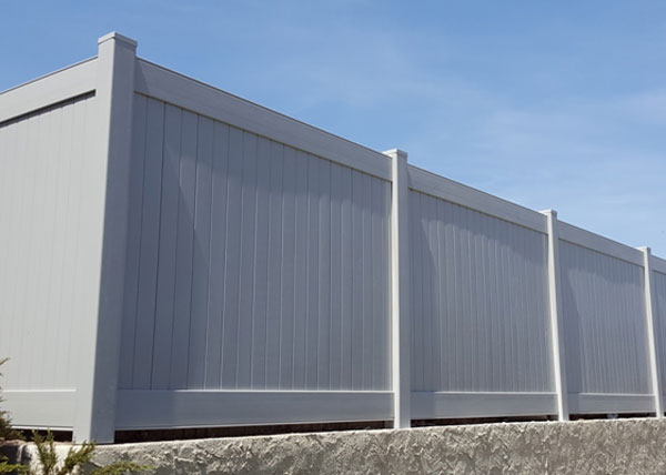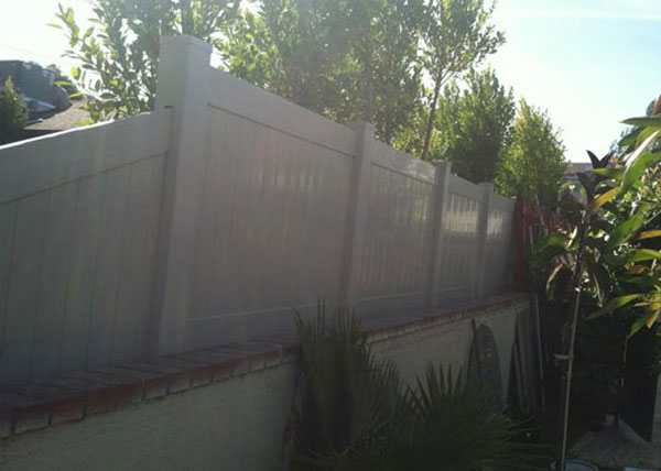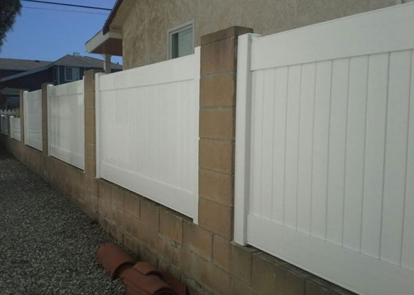 J&J Fence installed this white privacy vinyl fence in Redondo Beach, CA. The vinyl fence was installed on top of a block wall and between block columns.