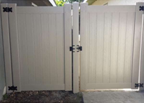 J&J Fence installed this two-tone, vinyl double driveway gate in Lomita, CA, featuring white posts and tan vertical boards.