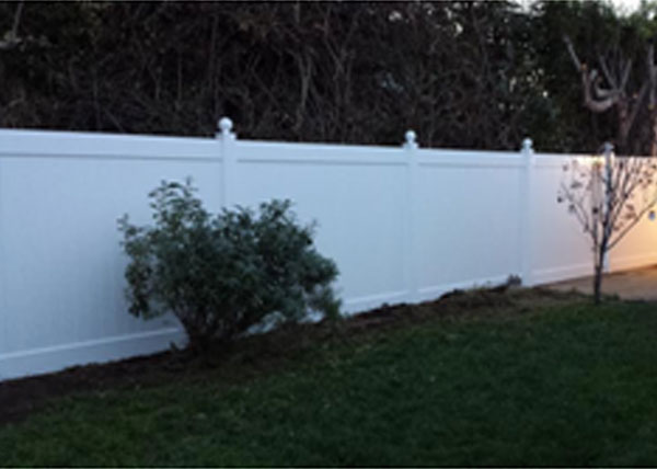 This 6 ft tall vinyl back yard fence was installed in San Pedro, CA. The white vinyl privacy fence features basic pyramid post caps.