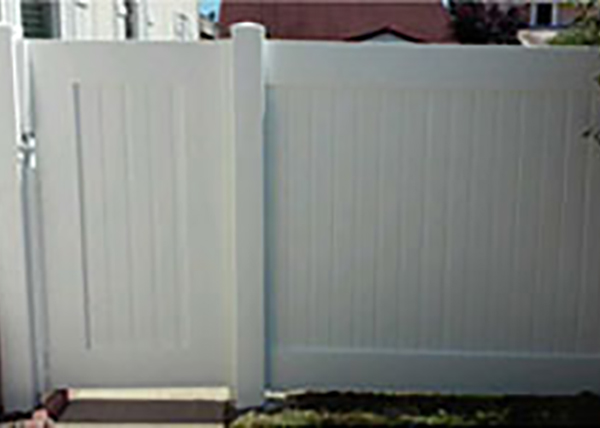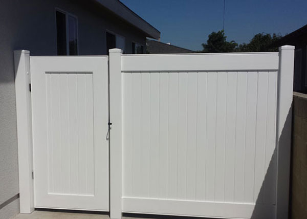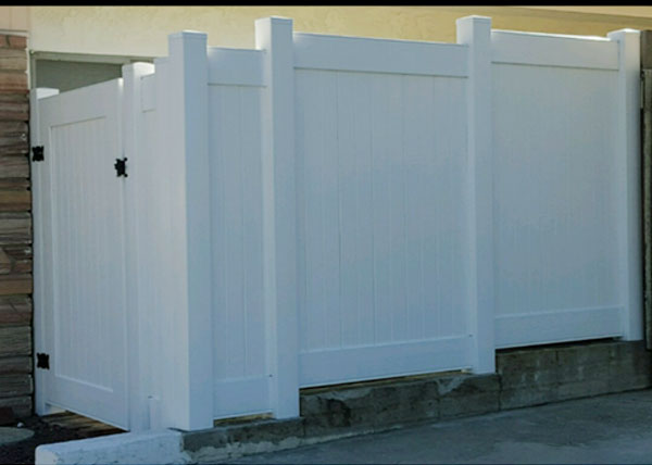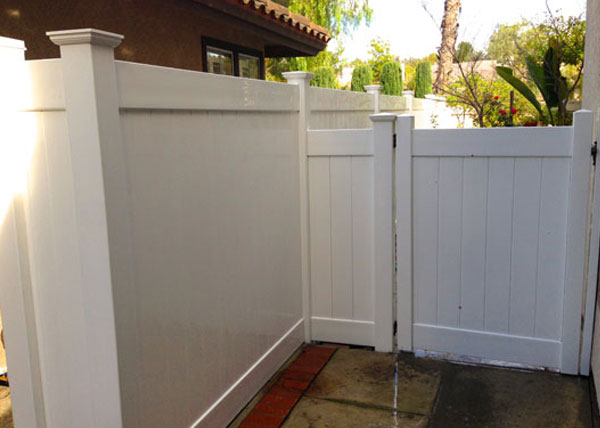 This is a white vinyl privacy fence and vinyl gate we installed in Hawthorne, CA. It features solid vinyl panels for optimal privacy, and includes a smooth finish vinyl. We also offer a wood grain embossed vinyl. Our vinyl fences come in a variety of heights and widths, and can all be customized to suit your specific needs.