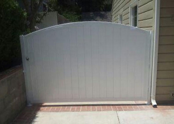This iron frame single swing driveway gate in Torrance, CA has an arched top and white vinyl vertical boards for privacy.The gate's iron frame is metallized for rust protection, primed and painted white.