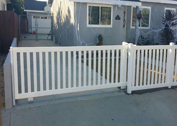 We installed this white vinyl fence in Gardena, CA. The residential vinyl fence features a closed top and bottom style, with a welded vinyl sliding driveway gate.