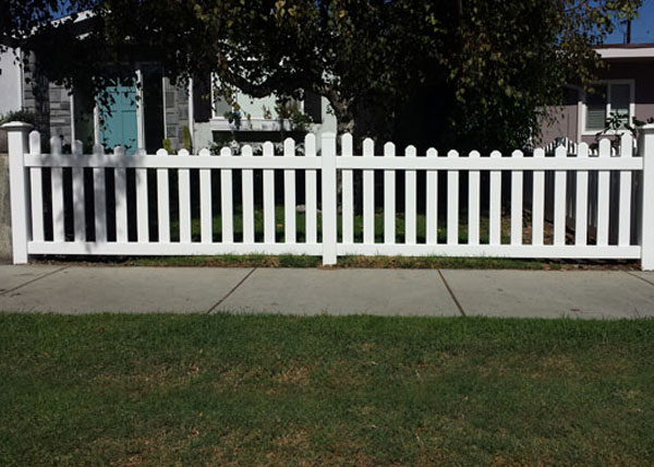 This is a residential fence installation in Santa Monica, CA. The white vinyl picket fence features a scalloped top style, dog eared pickets, and New England style posts. Vinyl fences are known to be long lasting and low maintenance. All vinyl fences and gates receive a lifetime warranty.