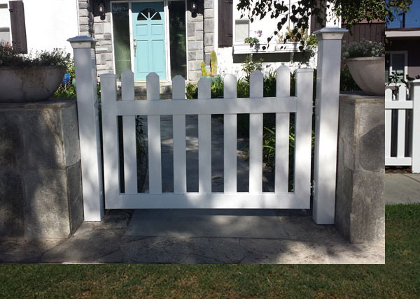 J&J Fence attached this white vinyl gate to a white vinyl privacy fence in Irvine, CA. The vinyl gate has a flat top with New England style post caps. The client wanted a lower gate so they could reach over the top of it to release the latch lock.