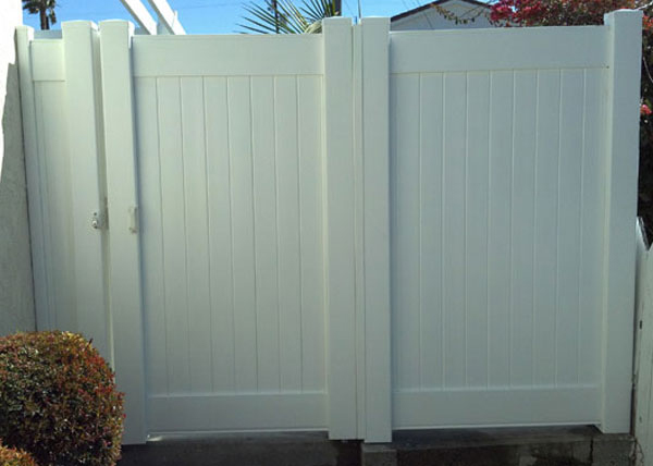 This residential fence installation in San Pedro, CA features a 6 foot tall white privacy vinyl gate with side fence panels. It includes a deluxe key lock.