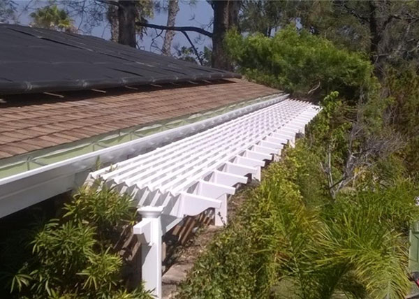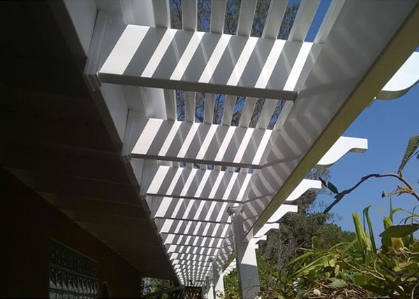 We installed this white vinyl pergola patio cover attached to fascia boards in Brentwood, CA. The pergola patio cover extends 36 inches away from the house.