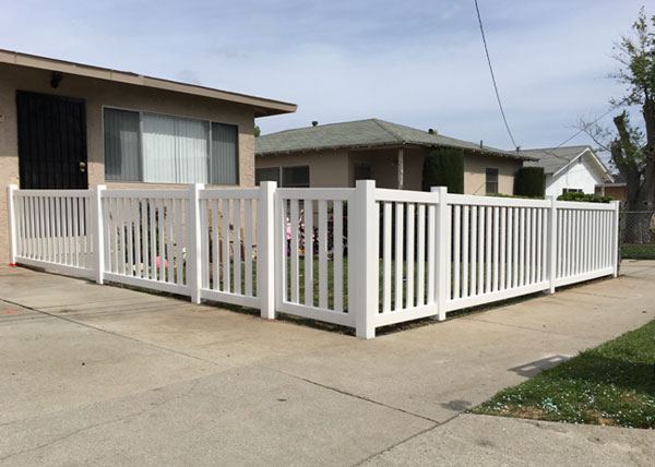 J&J Fence completed a vinyl fence and gate installation in Carson, CA that includes a seamless transition from a 6ft tall privacy fence to a 4ft tall vinyl picket fence.
