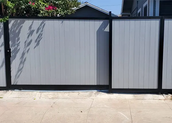 J&J Fence installed this black iron-framed privacy fence in Long Beach, CA. It features a rolling driveway gate with wood vertical boards painted in gray.